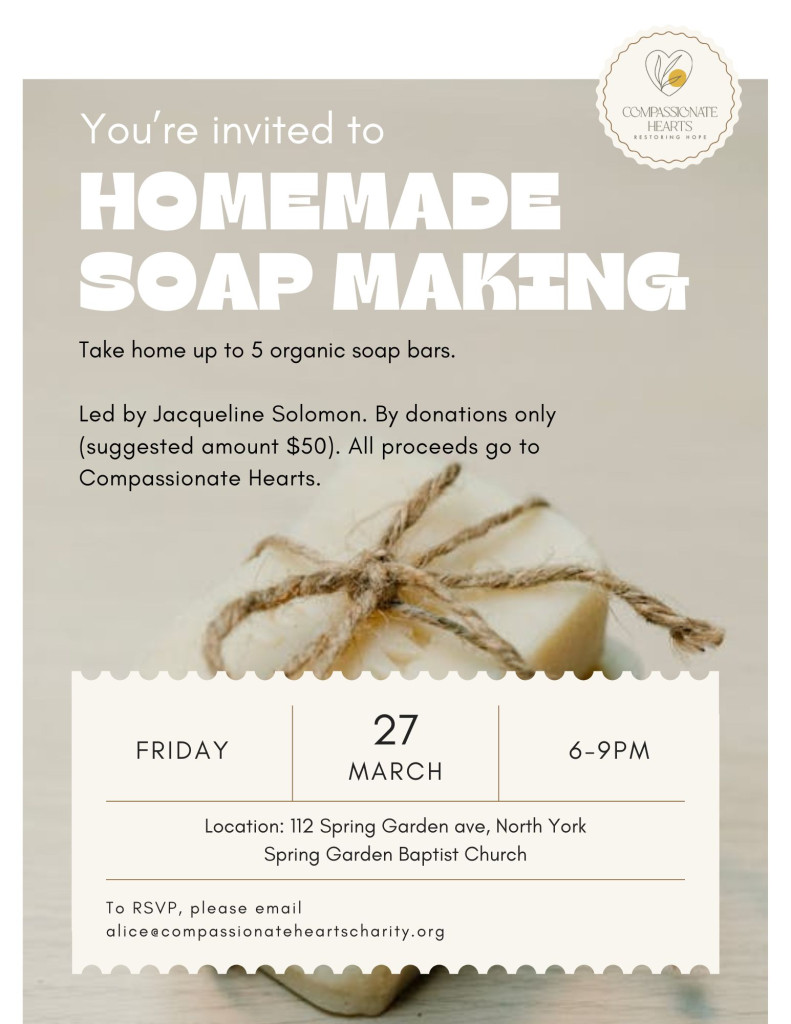 Take home up to 5 organic soap bars. Led by Jacqueline Solomon. By donations only (suggested amount $50). All proceeds go to Compassionate Hearts.